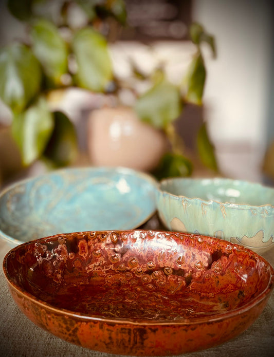 De verschillende reactieve glazuren, zorgen ervoor dat elk item uniek is! Gemorst glazuur verzamel ik en gebruik ik opnieuw, zodat er niets verloren gaat.